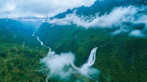 滴水滩瀑布挂在关索岭大山上,由三个大瀑布和几十个中小瀑布组成,上为连天瀑布(离关岭县城5公里),中为冲坑瀑布,下为高滩瀑布,集高、大、多、美、奇诸多特点一身,总高度和个体都为黄果树瀑布群之首。这里两山对峙,东为大坡顶,西为关索岭,中间是深达700米的霸陵河峡谷。