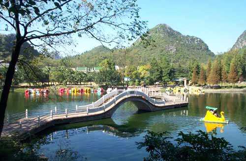 西山公园占地26.63公顷,由4座自然岩石组成,岩峰最高30余米。山石嶙峋,奇异多资,岩石峰上生长各类树木及藤本植物,树木葱茏,藤萝密挂,树根裸露盘曲,或环抱山石,或穿插于石缝间,如虬龙怪蟒令人叹为观止。园内峰銮竞秀、错落有致、树木繁茂、曲径通幽,是我国罕见的城区喀斯特园林,因其小巧玲珑,又被称为袖珍喀斯特公园。园内有松石亭、望江亭、晨曦亭、半山亭和后山九龙寺等景点,园内动物园具有各种不同种类的动物37种,儿童乐园功能齐全。
