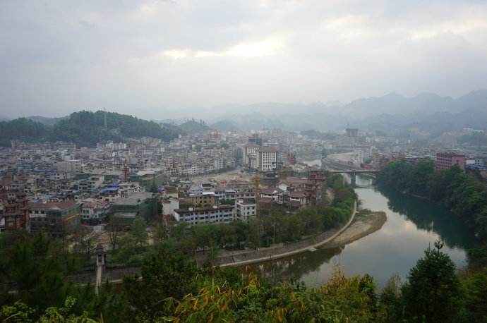 “玉水金盆”即县城景观,位于平塘向斜轴部,是一个典型的向斜谷地中的城镇。受燕山运动褶皱格架的影响,向斜晚近期的新构造抬升较两侧背斜区微弱,加之核部中三叠统细碎屑岩岩性软弱,因此河流流经向斜核部时,水力坡降平缓而使河道发生蛇形弯曲,从而形成县城“东倚龙脑坡,南、北、西三面被平舟河环绕,登临莲花坡聚胜塔俯瞰,宛如盆景”的风光画面。