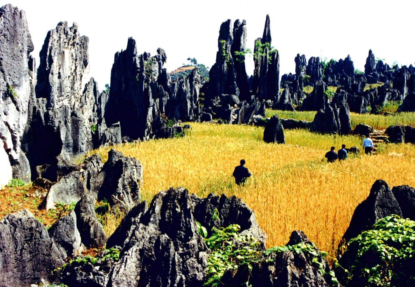 进入石林区,举目远眺,妙景叠现,石笋、石柱拔地而起,形若珍禽异兽,有的酷似人物,千姿百态,栩栩如生。步入石林中,纵横联合的小径,随着视角的转换,使人如入幻境。仰视突出于群峰之上的“擎天柱”,似觉其峰插入云天,将天高高撑起。“利剑峰”似利剑直刺蓝天。“采药老人”拈须含笑,柱杖攀登。“金猴望月”神志自如,仰视星空。破土而出的峰石,争相成林,人们根据其自然形态,冠以各种动听的景点名称。如“群象争饮”、“雄鹰展翅”、“武士峰”、“鹰翼峰”等。步入“一线天”峡谷,宛如放舟长江三峡。来到“虎跳岩”,悬崖阻住去路,而蹲伏崖巅的猛兽,成迎面扑来之势,环顾左右,似乎“山穷水尽”,弯腰从峭崖下的“桥洞”穿出时,又得“柳暗花明”。进入“别有洞天”中小憩片刻,顿感心旷神怡,疲劳消除,游兴大增。同六座石峰巧妙组成的“山川”二字挺拔遒劲,