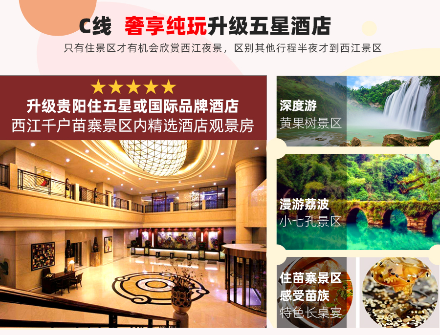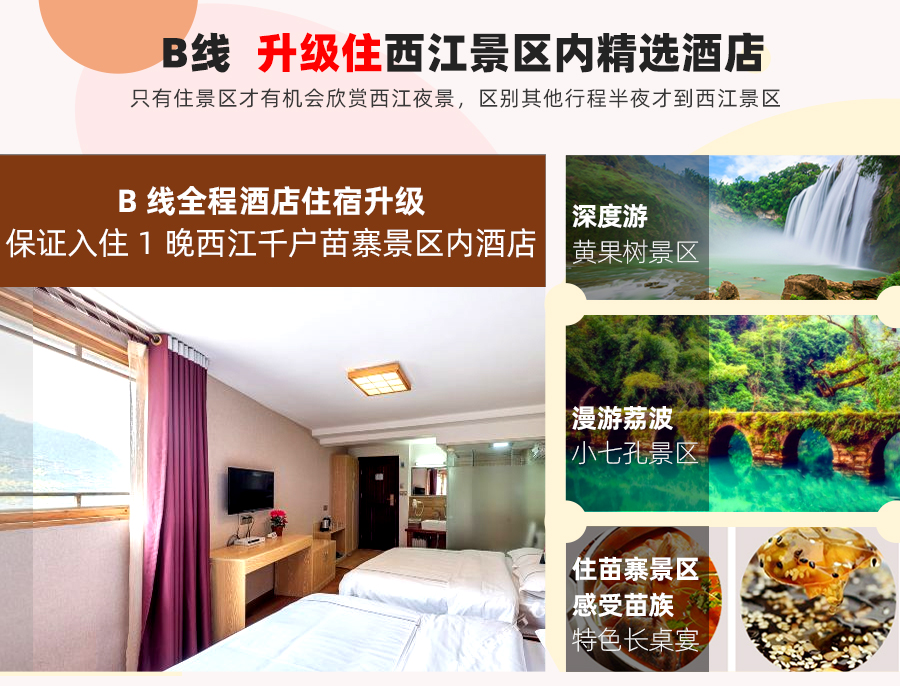 特点7住宿:我们【保证入住1晚西江千户苗寨景区内酒店客栈】;提供A/B/C3种不同酒店等级套餐选择!【B线和C线全程升级酒店住宿】