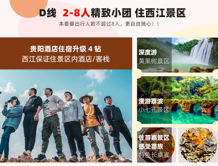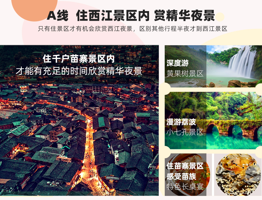 特点8时间:更长的景区游览时间, 🙍保证黄果树天星桥景区游览上下全段时间(其他团队只游半程、注意对比);更早到达西江景区, 🤓晚上住西江景区内, 🙋♀️更充足的时间欣赏西江千户苗寨和景区夜景;