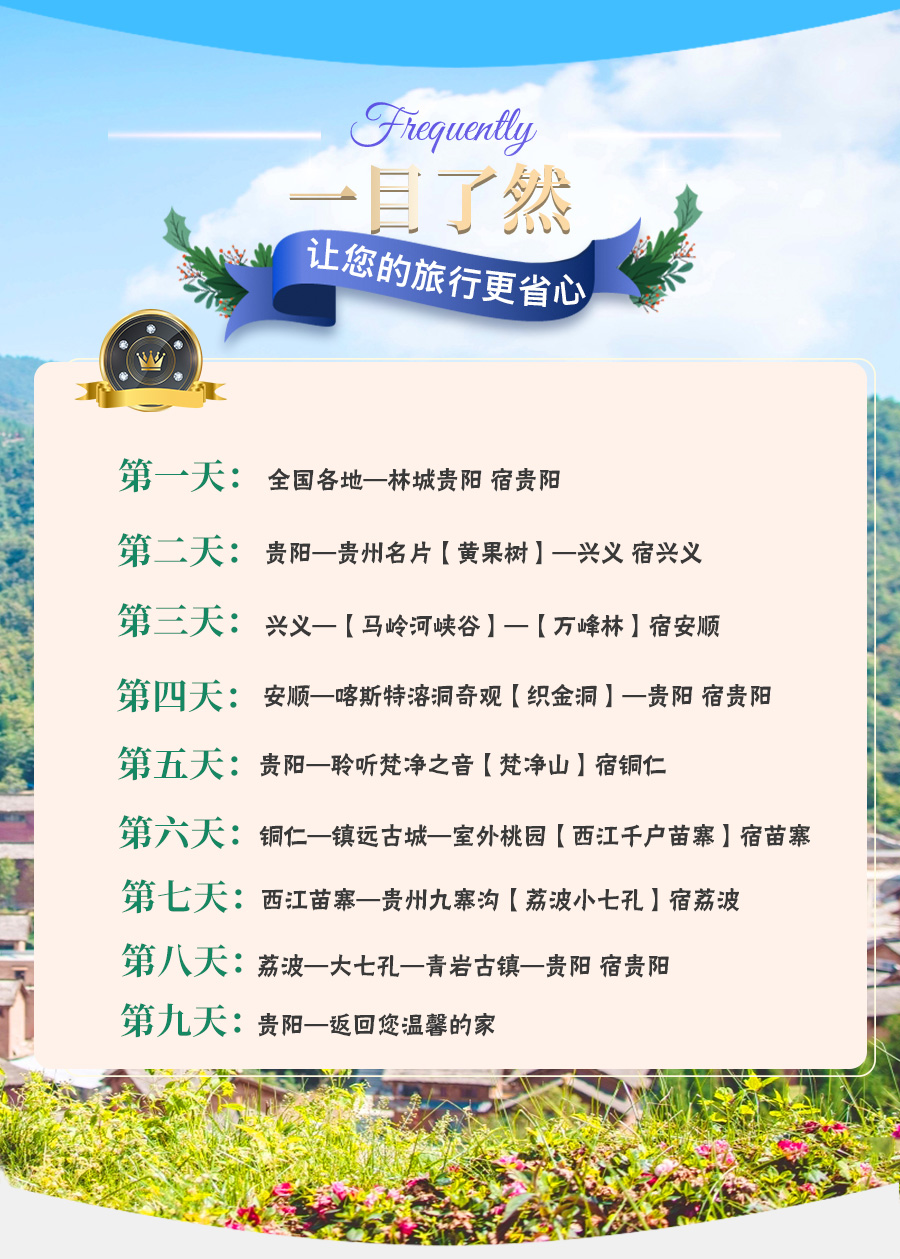 1、若您不需要往返大交通,请戳【当地游】产品:贵州贵阳+黄果树+马岭河+织金洞+梵净山+荔波9日8晚私家团(4钻) 当地游