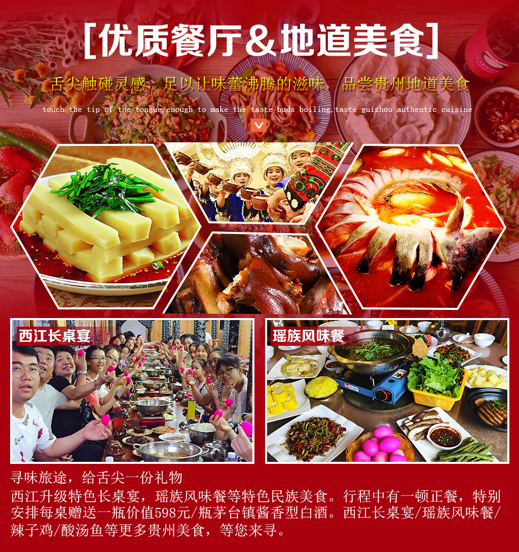 黔菜美食——西江长桌宴、瑶族风味餐,行程中有一顿正餐,特别安排每桌赠送一瓶价值598元/瓶茅台镇酱香型白酒。