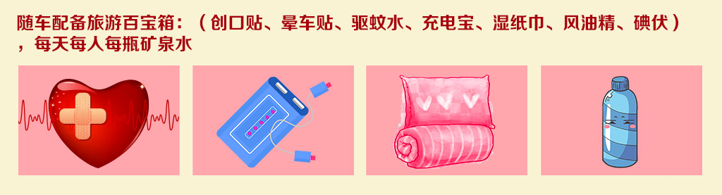 用车保障——正规空调旅游车,安排专业老司机为您保驾护航!随车配备旅游百宝箱(创可贴、晕车贴、驱蚊水、充电宝等)每人每天1瓶矿泉水。