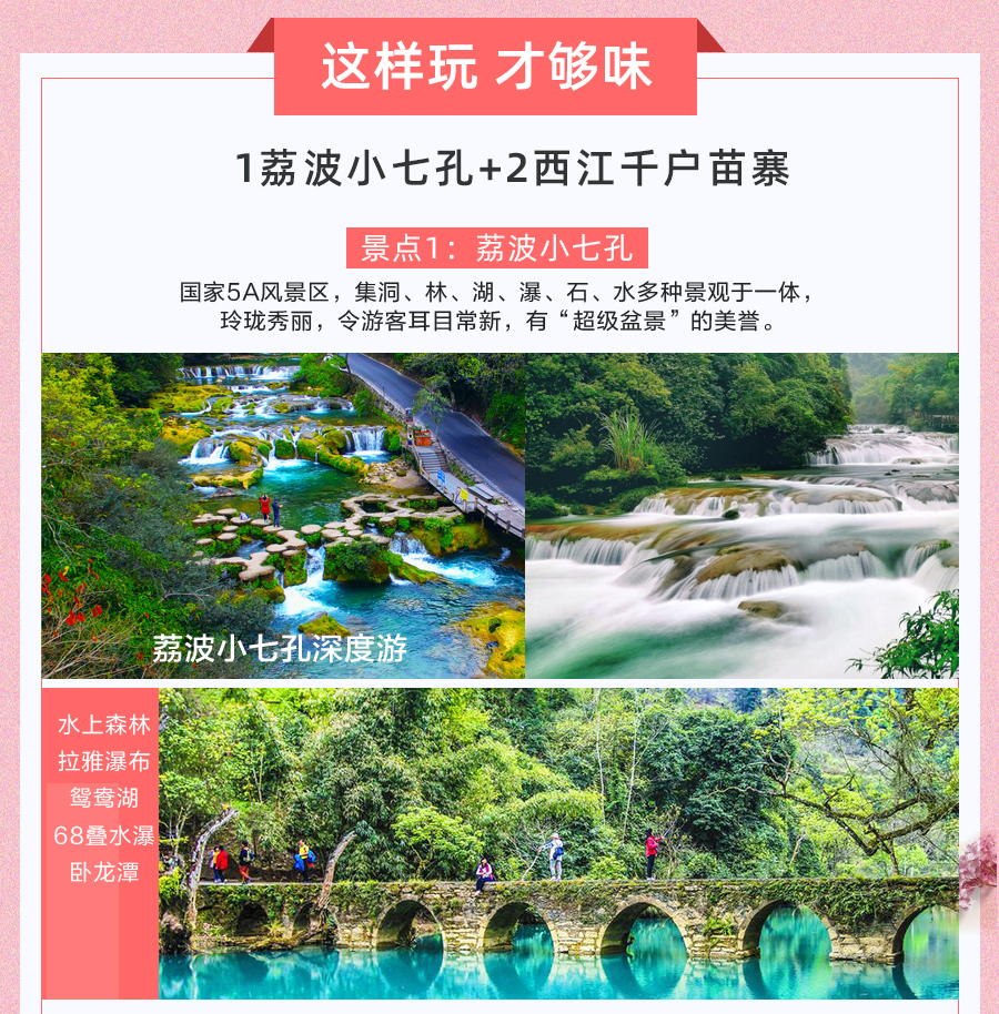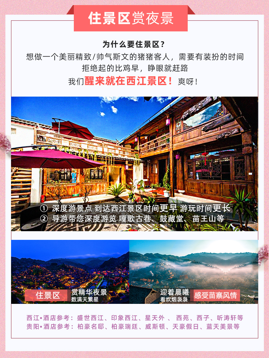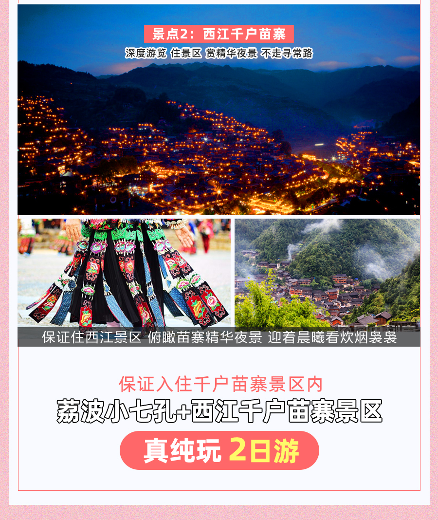 贵州崇山峻岭间的千户苗寨宛如被时光遗忘的仙境,承载苗族千年历史文化。上千户吊脚楼依山层叠似画卷,木质建筑古朴精美。漫步石板路似穿越回古时光,苗族同胞着传统服饰、戴银饰,街道满是生活气息。苗族博物馆展现民族故事,夜景如梦似幻,美食如长桌宴令人垂涎,还能穿苗族服饰拍写真。来千户苗寨,远离喧嚣,开启难忘心灵之旅。