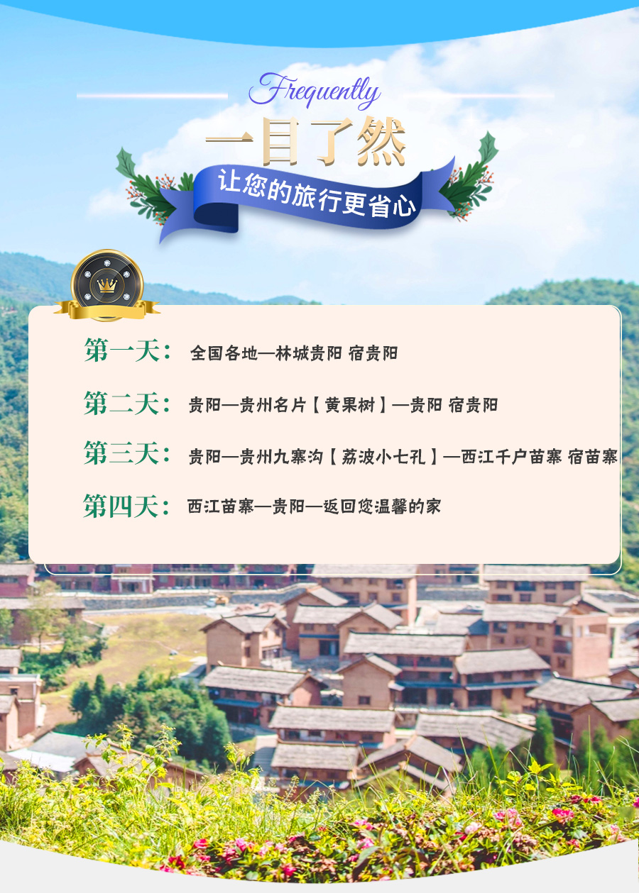 1、若您不需要往返大交通 嗯,请戳【当地游】产品:贵州贵阳+黄果树+荔波+西江千户苗寨4日3晚私家团(4钻)当地游