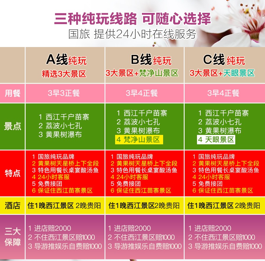 特点5门票:A线包含黄果树、西江苗寨、小七孔(B线增加梵净山景区;C线增加天眼景区;注意区别)