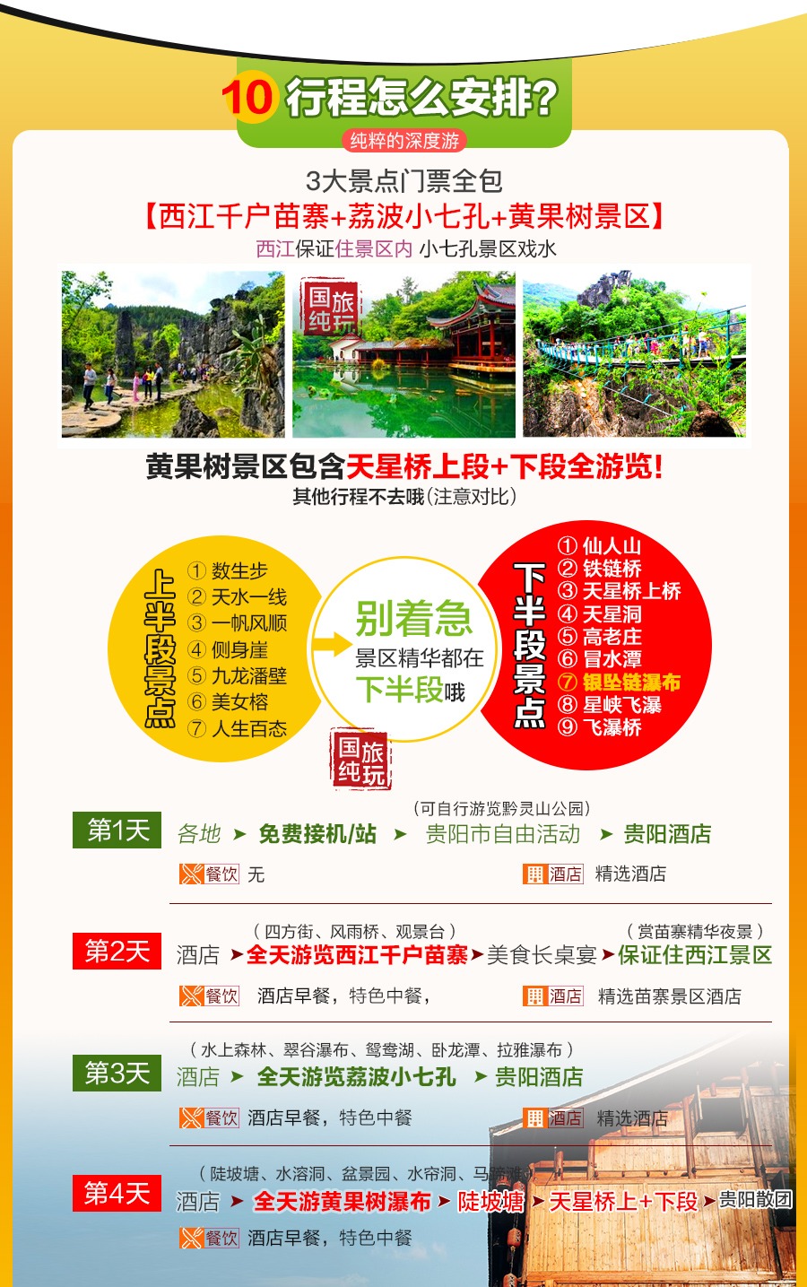 温馨提示:由于贵州旅游进入旺季, 🤩以及天气等其他原因 🤽♀️, 👨🏭行程游览顺序可能临时出现调整改变:原第2天西江景区游览住西江景区, 🤱可能改为第3天游览西江千户苗寨景区住西江千户苗寨景区;原安排第3天荔波小七孔景区游览改为第4天游览;原第4天游览黄果树瀑布景区改为第2天游览。