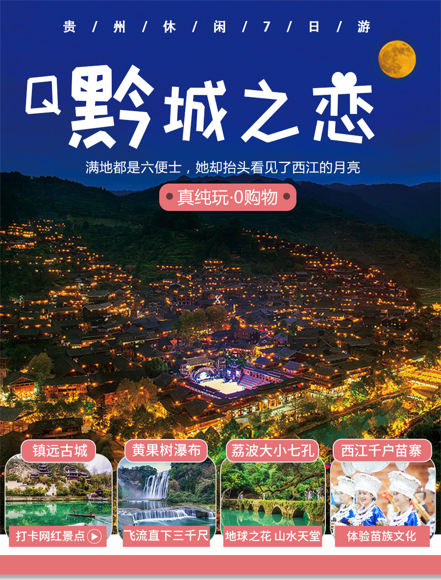 贵州崇山峻岭间的千户苗寨宛如被时光遗忘的仙境,承载苗族千年历史文化。上千户吊脚楼依山层叠似画卷,木质建筑古朴精美。漫步石板路似穿越回古时光,苗族同胞着传统服饰、戴银饰,街道满是生活气息。苗族博物馆展现民族故事,夜景如梦似幻,美食如长桌宴令人垂涎,还能穿苗族服饰拍写真。来千户苗寨,远离喧嚣,开启难忘心灵之旅。