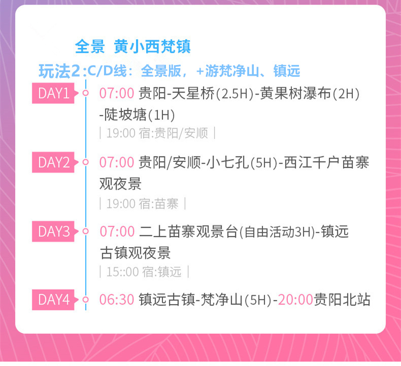 3、AB线:【大七孔+青岩古镇+下司古镇】 嗯, 🙎悠闲版玩法1:最后一天团上可送机场/火车站(18:00后) 呢, 呢CD线:+游梵净山+镇远,贵州全景。
