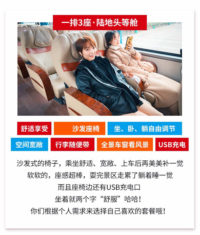 1、全新头等舱保姆车 嗯,2+1布局座椅,一排三座 🤵♀️, 嗯超大空间;全车标配USB手机充电接口 呀,车载WIFI, 💟(充分缓解景点分散的舟车劳顿)