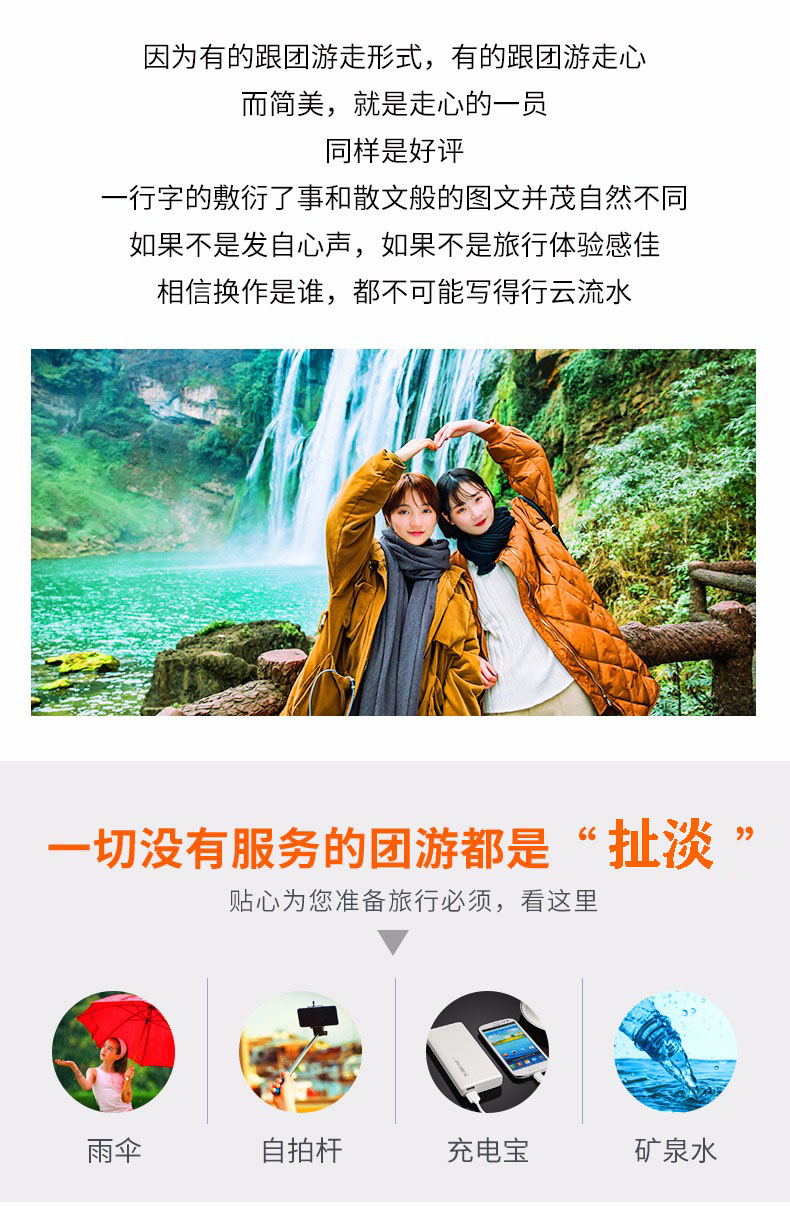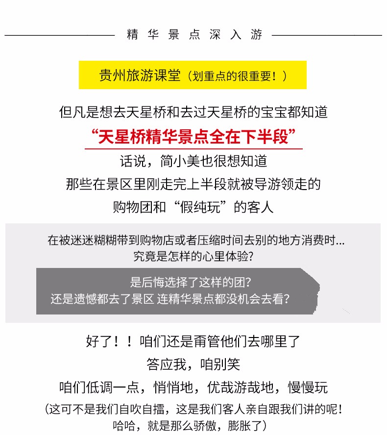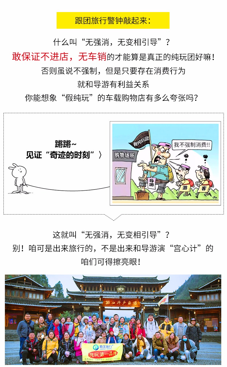 2、保证真纯玩,全程无任何购物安排(例如:隐形店【苗妹非遗博物馆】和【多彩贵州城】等)立赔3000元/单【注意识别真假纯玩】;