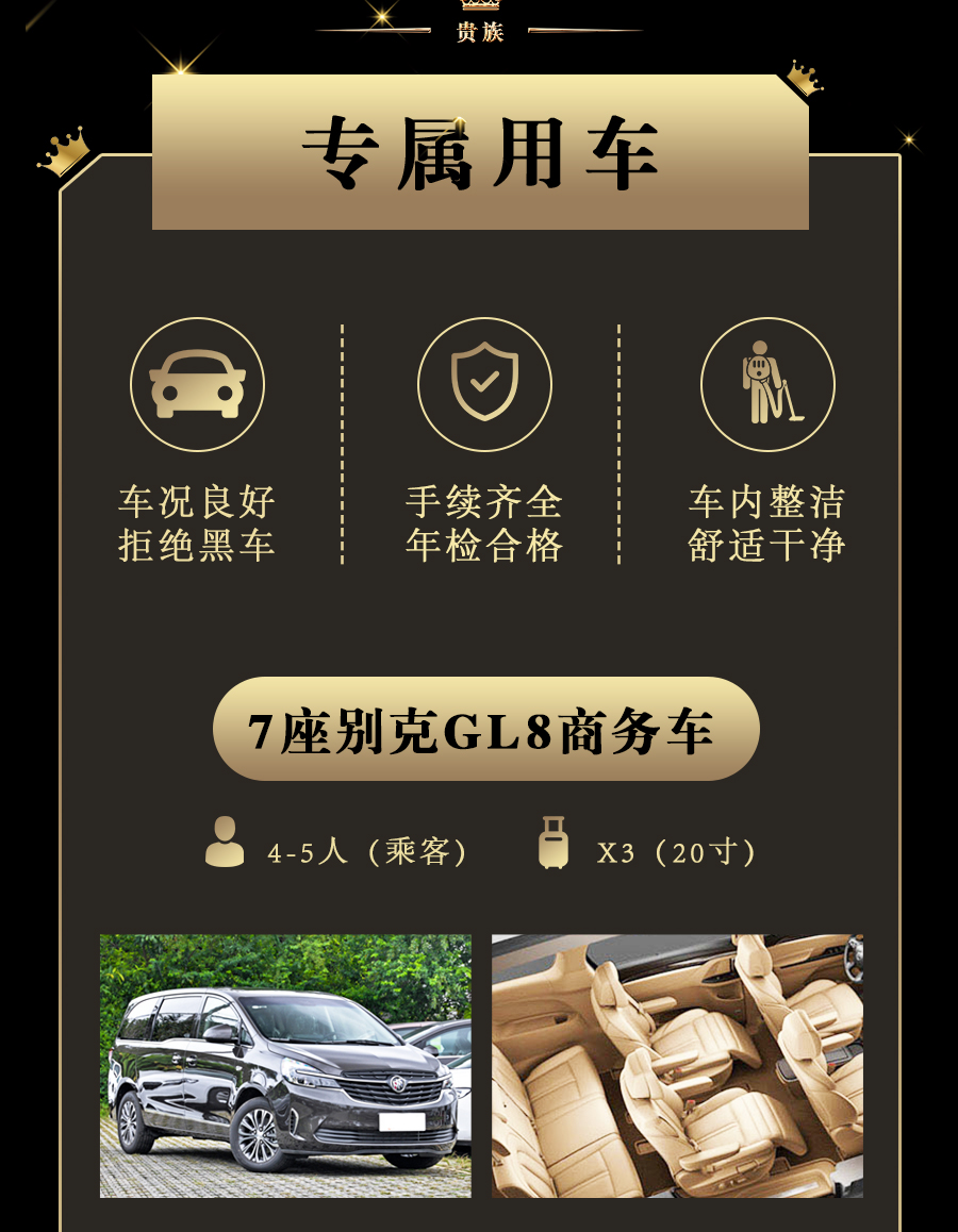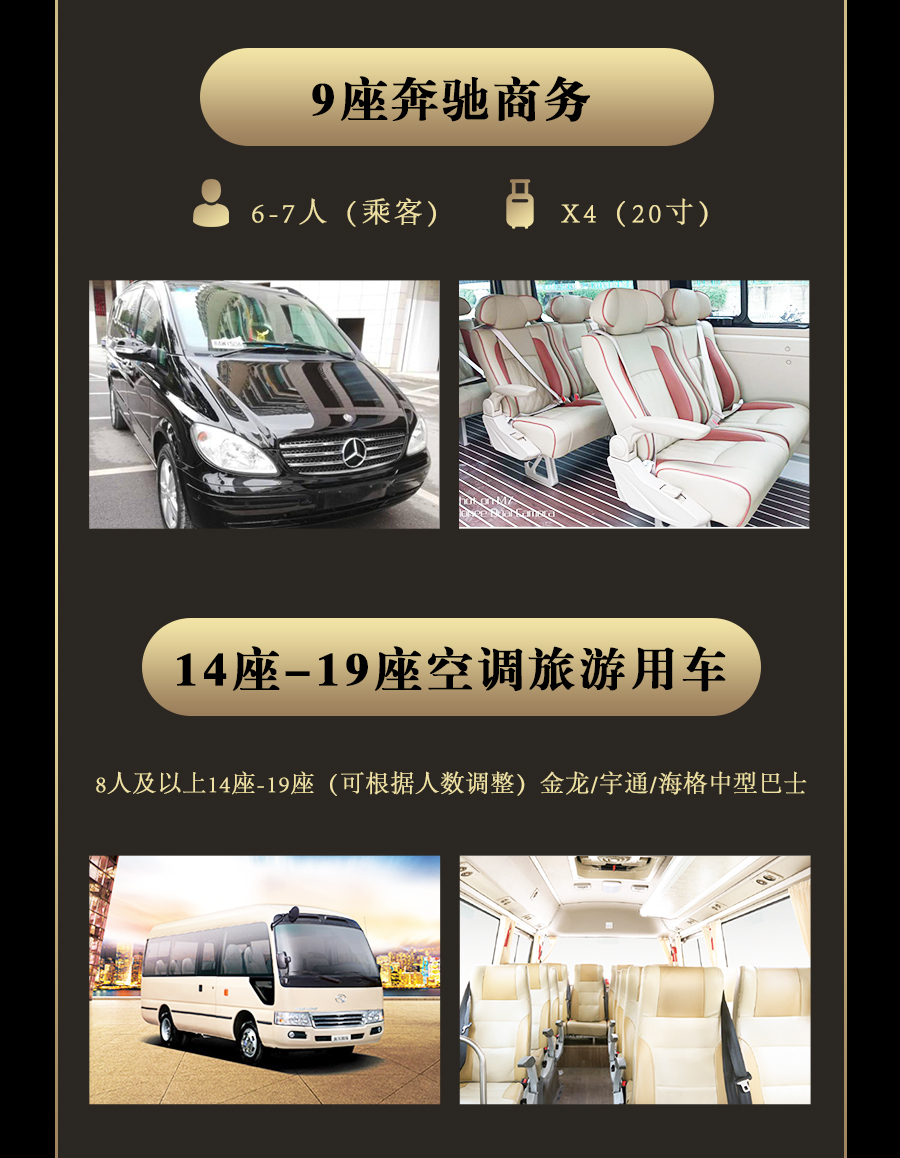 4、专属用车,4-5人安排别克GL8;6-7人安排奔驰商务,8人以上可选宇通/海狮 呀,尽量满足您的用车需求!