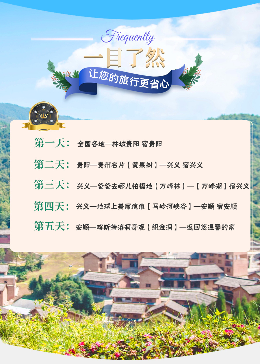 1、若您不需要往返大交通,请戳【当地游】产品:贵州黄果树+兴义+马岭河峡谷+万峰林+万峰湖5日4晚私家团(5钻)
