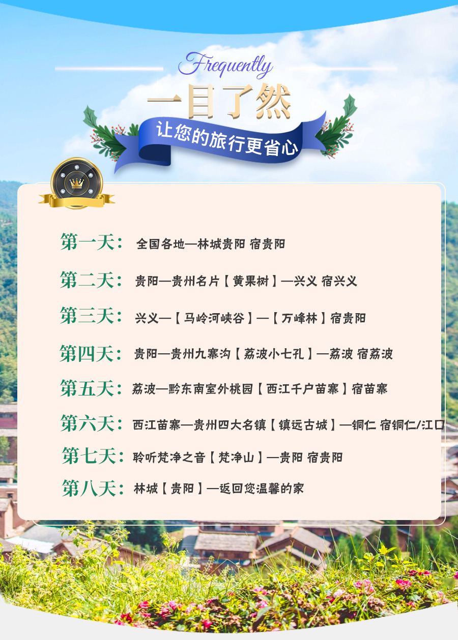 若您不需要往返大交通 呀, 嗯请戳【当地游】产品:贵州黄果树+万峰林景区+马岭河+荔波+西江千户苗寨+梵净山8日7晚私家团(5钻)