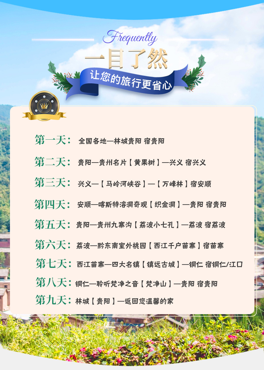 若您不需要往返大交通, 嗯请戳【当地游】产品:贵州黄果树+万峰林+马岭河峡谷+织金洞+荔波+西江千户苗寨+梵净山9日8晚私家团(5钻)