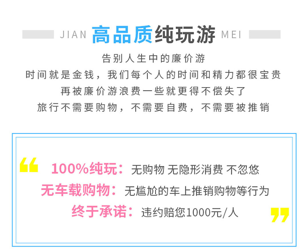 2、保证真纯玩 🧑💼,全程无任何购物安排(例如:隐形店【苗妹非遗博物馆】和【多彩贵州城】等)和导游车上卖东西立赔3000元/单【注意识别真假纯玩】