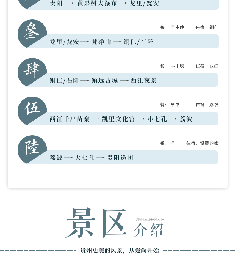 不含景区小交通:黄果树观光车50元/人、景区保险10元/人,小七孔观光车40元/人、保险10元/人,西江观光车20元/人 😄,梵净山观光车20元/人,镇远摆渡车20元/人, 嗯费用需自理。