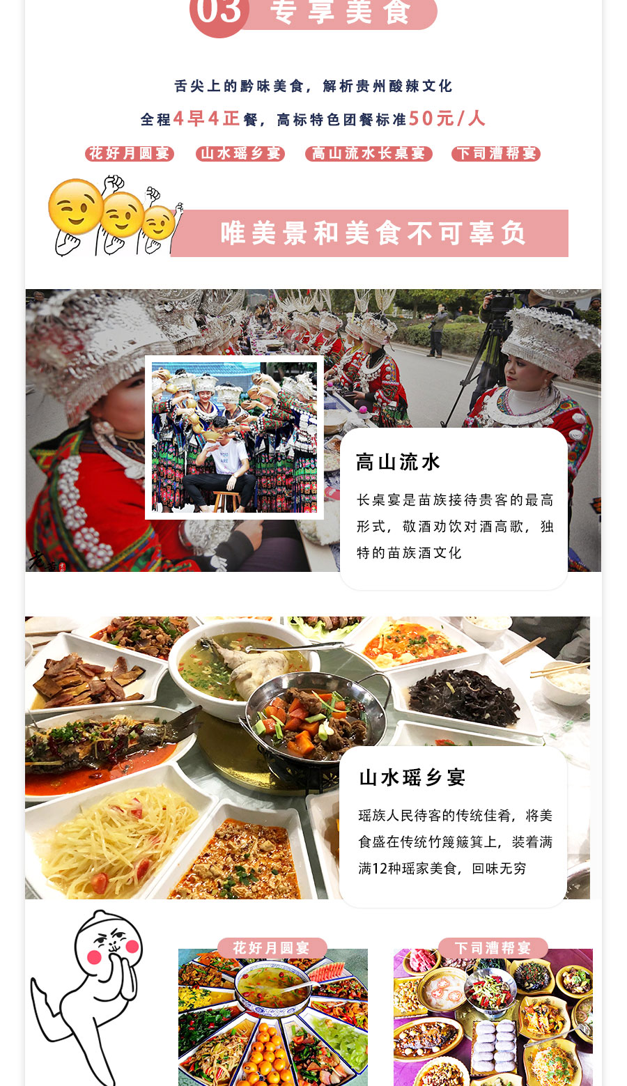 四大美食:花好月圆宴、山水瑶乡宴、高山流水长桌宴、下司漕帮宴 呢, 呀高餐标50元/人