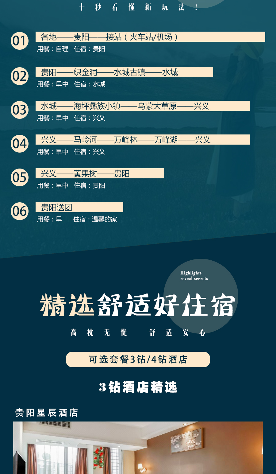 1. 不含景区小交通:黄果树观光车50元/人、保险10元/人;织金洞观光车20元/人,保险10/人;万峰林观光车+小火车100元/人;海坪彝族小镇观光车40元/人;乌蒙大草原景区观光车20/人, 😋保险10元/人;
