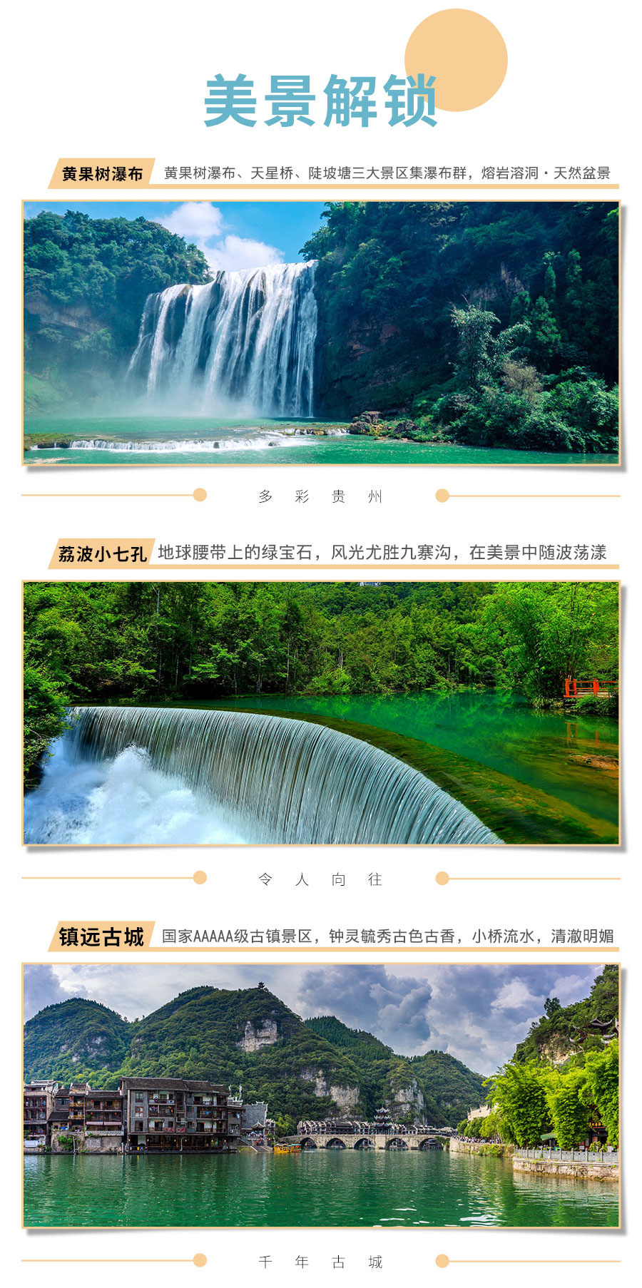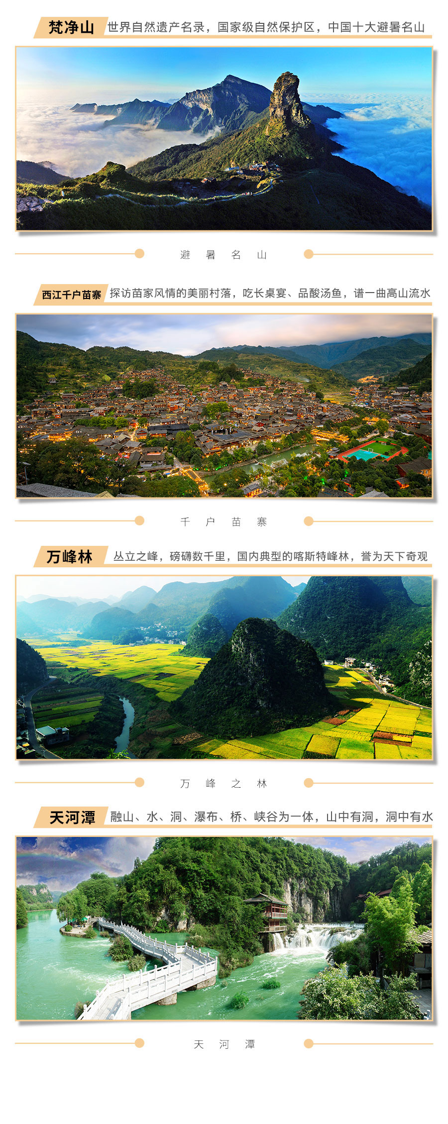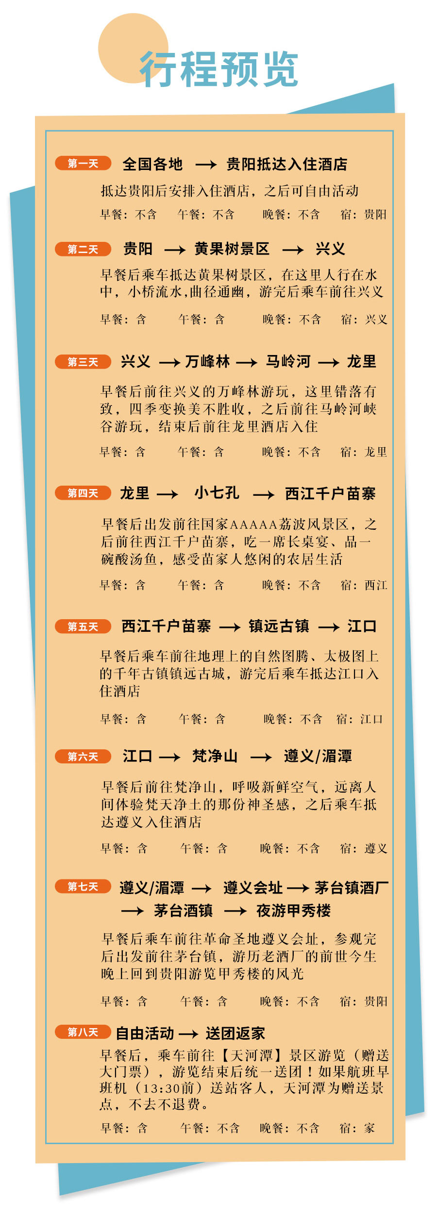 2.不含景区小交通, 😗黄果树环保车50元/人+保险10元/人,2、梵净山环保车20元/人, 👨🚀索道单程70往返140元/人(必须乘坐), 🧝♀️3、西江千户苗寨景区电瓶车20元/人(必须乘坐) 🦵, 🤙4、荔波小七孔景区电瓶车40元/人+保险10元/人(必须乘坐),、5.遵义会议会址电瓶车20元/人(必须乘坐)6、遵义景区讲解费+蓝牙耳机20元/人7、镇远摆渡车20元/人(必须乘坐) 8、万峰林观光车50元/人(必须乘坐)9、天河潭电瓶车30元/人(必须乘坐) 👳♀️,溶洞票43元/人 嗯,索道80元/人。