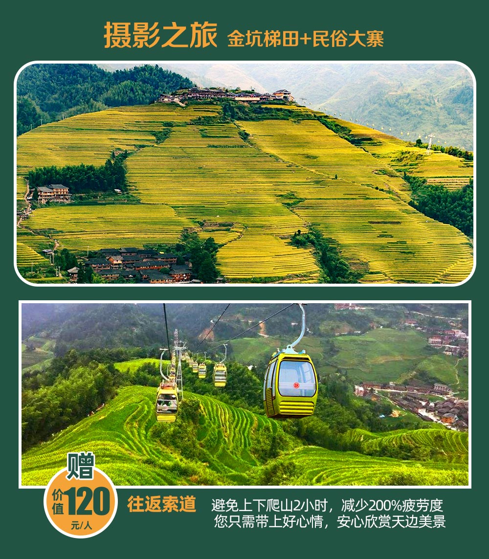 ◆ 贴心赠送金坑大寨梯田往返索道, 呀减轻旅途疲劳,俯瞰梯田全景奇观。