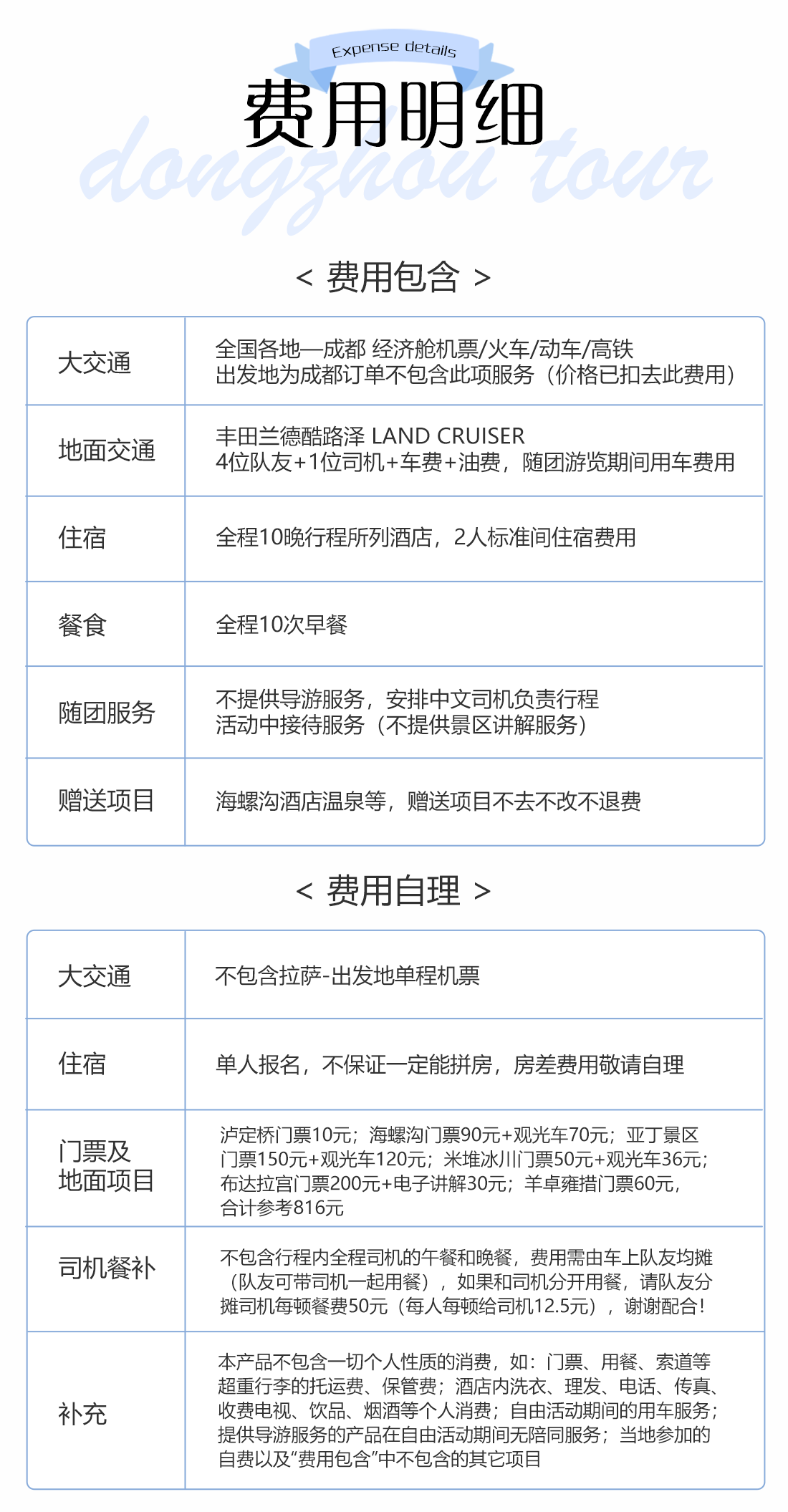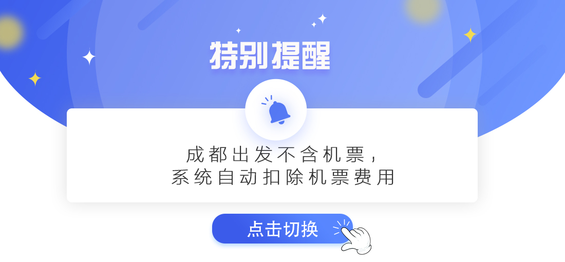 2.机票说明:本行程包含各地至成都单程机票, 呢预估价格1000元/人,(出发城市为成都的订单, 嗯系统自动减除机票费用, 🧑🦼机票自理)