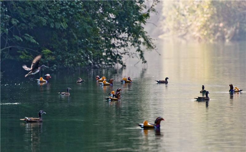 鸳鸯湖是一个天然的喀斯特高原湖,划船入内仔细观察,这里的树木植根于水中的石头,又透过石头扎根于河床。由于地形、水深和光线的变化,可以看到五颜六色的景色。
