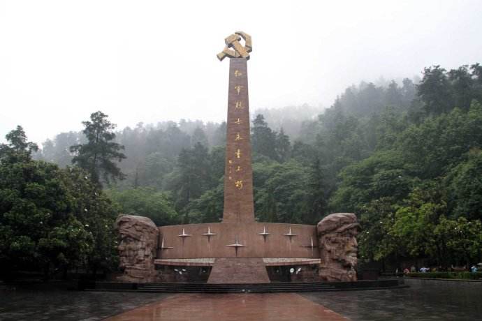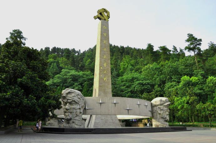 漫步出会址,路过扬柳街一侧的红军总政治部驻地,一座郁郁葱葱的山岗便是遵义红军烈士陵园,人们尊称为“红军山”。贵州遵义红军山纪念碑位于遵义市小龙山上,陵园正面碑正面是邓小平同志手书的竖写“红军烈士永垂不朽”八个金色大字。碑后是红三军团参谋长邓萍墓。为纪念遵义会议五十周年时兴建的一座别具特色的纪念碑。